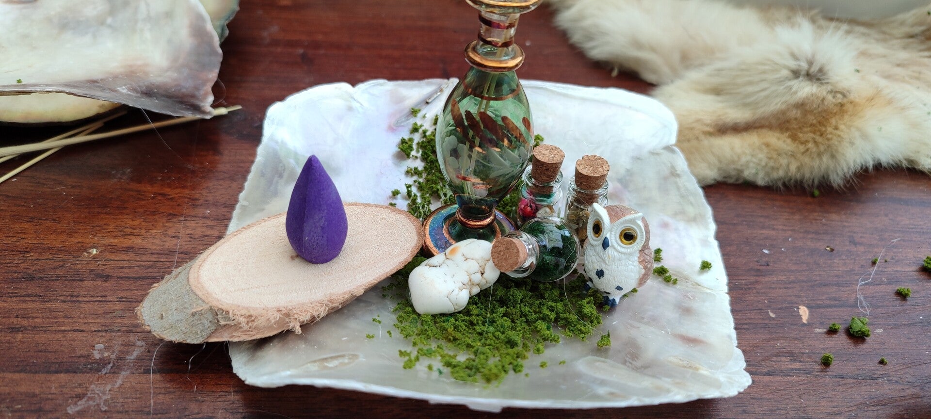 Wierrook houder tafereeltjes op een schelp. tussen de 13 en 15 cm. breed. Je kunt je eigen bloem of kruiden in het vaasje zetten. Erg leuk als onderdeel van je altaar of om zo neer te zetten